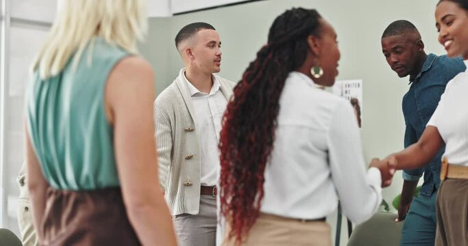 Diverse group of people line up at job fair. Hopeful faces show optimism for economic recovery. Applicants look prepared for hiring process. Interior modern office space. Opportunity for career