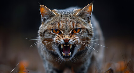 A cat with its mouth open and teeth bared, looking angry. The cat is standing on a grassy area