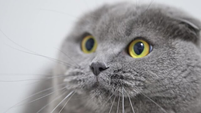 Emotional grey Scottish Fold cat hisses fiercely, mouth open, eyes wide in reaction.