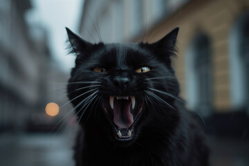 Angry black cat hissing at city street