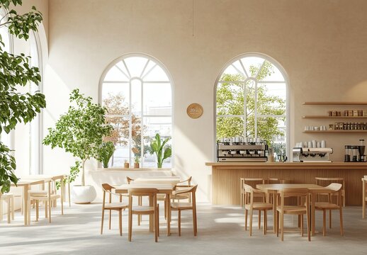 Modern minimalist-style cafe interior design with light wood and white colors․
