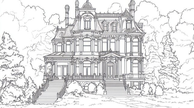 Historic drawing of grand mansion in park setting.  Possible use Architectural study, historical reference