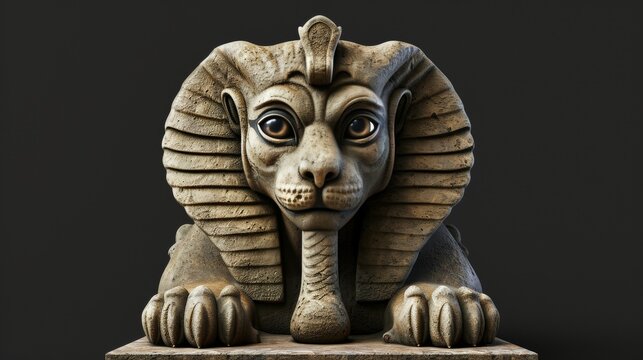A majestic stone sculpture resembling a lion with a Sphinx-like appearance, sitting in a regal pose on a pedestal. This statue evokes mystery and grandeur, ideal for cultural and historical projects.