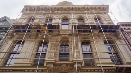 Construction worker in lift bucket of crane restore and repair historic facade of building. Man in cradle, restoring plaster decoration on facade. Workers painting building, external building work