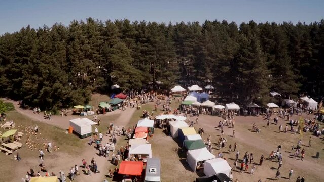 drone footage of a festival, an artisan market in an open-air museum, lots of people