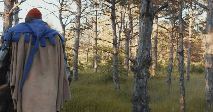 Walking in the forest A man with a beard in a medieval costume of a knight looking around. Back view. Close-up. Reconstruction of historical events