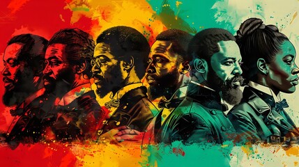 Collage of historical figures integral to Juneteenth, creative illustration in black, green, red and yellow colors, flat style.