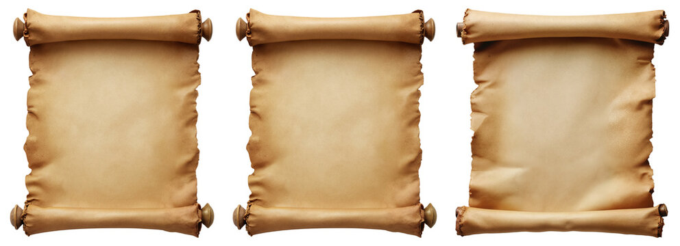Ancient Parchment Scrolls Collection – Set of Three Vintage Paper Manuscripts with Wooden Rollers for Graphic Design, Game Assets, and Historical Illustrations on Transparent Background