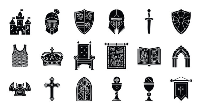 A diverse collection of medieval history and Christian religion icons offering essential graphic elements for historical presentations, fantasy game designs, or educational materials.