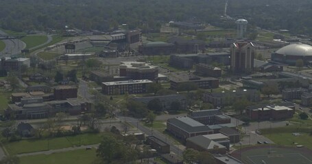 Aerial view of Fayetteville state university historically black college administration building with dramatic colorful sunset sky