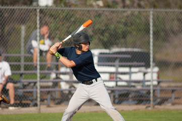 Portrait of serious lovely school age African American boy baseball hitter with baseball bat wearing eye black, ready to hit a shot and waiting for pitch while enjoying playing game on green field.
