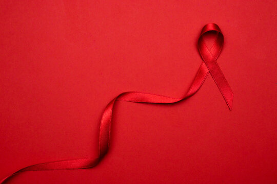 Hiv day. Red ribbon symbol in hiv world day on dark red background. Awareness aids and cancer. Aging Health month concept.
