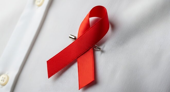 White shirt with red ribbon campaigning for aids vaccine awareness