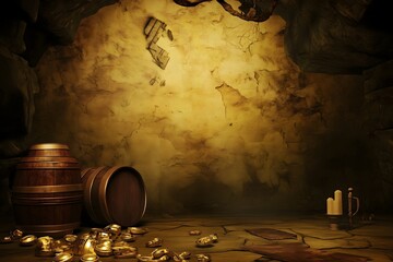 Ancient cellar or pirate cave background with wooden barrels, spilled gold coins, and a lit candle. A mysterious treasure hoard for a fantasy, adventure, or historical concept