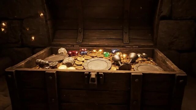 Ancient wooden treasure chest sits open inside a dark stone dungeon revealing a dazzling hoard of gold coins precious jewels and antique metal artifacts for gaming concepts.