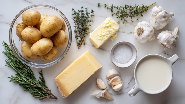 Rustic culinary ingredients near flour-dusted cookbook