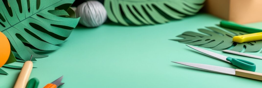 Craft Supplies and Tropical Leaves - Green background featuring crafting tools, yarn, and paper tropical leaves. Perfect for DIY, crafting, and hobby blogs