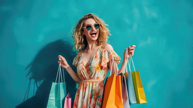 A small dog dressed in fashionable , wearing sunglasses and smiling happily with his head tilted back holding shopping bags on a white background.