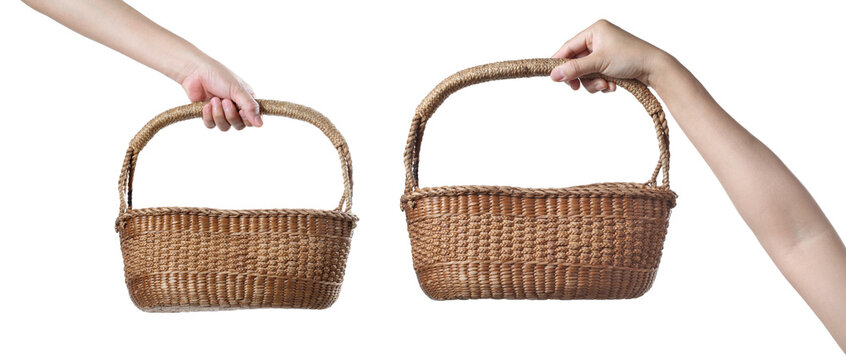 Chef holding wooden basket on white background