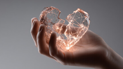 Hand holding broken heart glowing with energy, symbolizing emotional pain and resilience. heart intricate details shine brightly, evoking sense