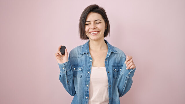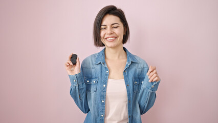 Young caucasian woman smiling confident holding key of new car over isolated pink background