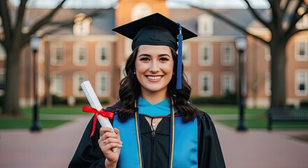Beautiful woman in a graduation gown holding a diploma isolated on transparent background