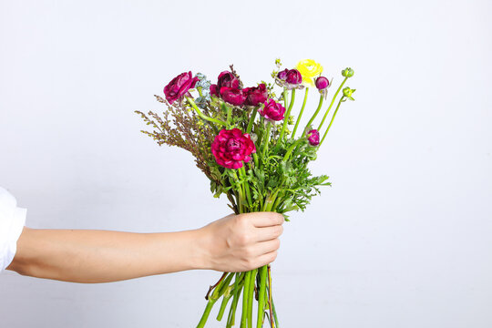 The young woman use right hand holding a bouquet