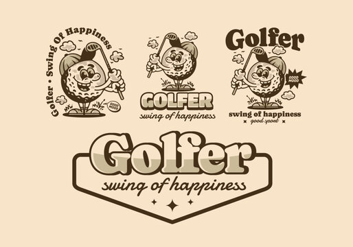 Golfer swing of happiness, mascot character illustration of golf ball holding a golf stick