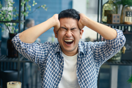 Depressed Asian man using smartphone in cafe, lifetyle concept.