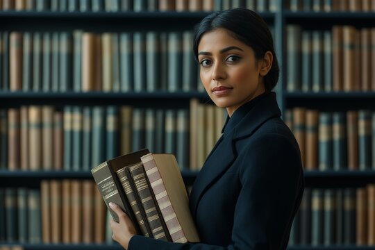 Skilled Female Attorney Holding Law Books in Library, Depicting Legal Knowledge and Focus