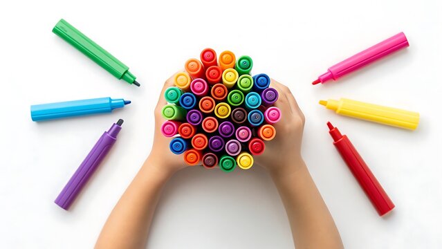 Top view of child holding bundle of colorful markers with scattered pens on white background