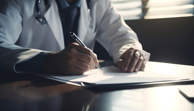 Close up of businessman hand holding pen and make signature in documents. Financial success concept. Generative Ai