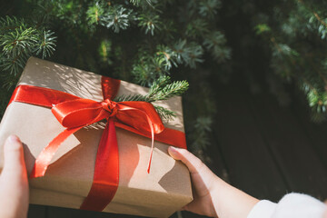 Hand of girl holding Christmas gift box tied with red ribbon