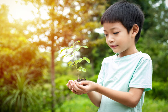 The little boy's hands are holding a small tree. Asian boy holding a seedling in his hand. The boy is smiling and stared at the small tree in his hand with natural sunlight.