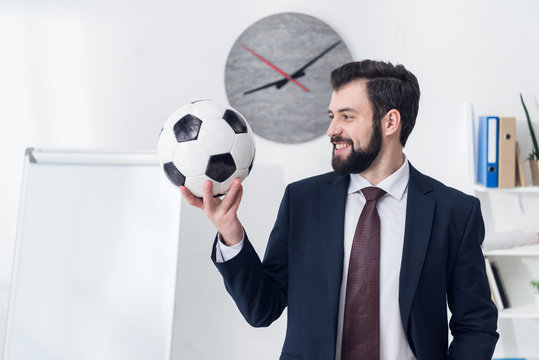 portrait of smiling businessman holding soccer ball in office