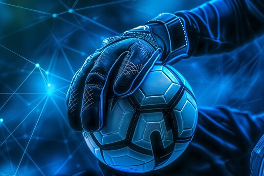 Goalkeeper glove holding soccer ball against futuristic blue network background