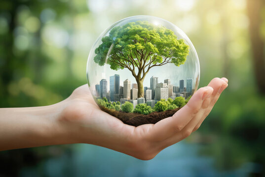 Human hands gently hold a glass sphere containing a miniature city with lush trees and green landscape. This symbolizes sustainable urban community, environmental care, and ecological growth.