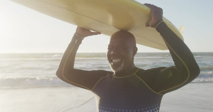 Portrait of happy senior african american man holding surfboard at beach, in slow motion