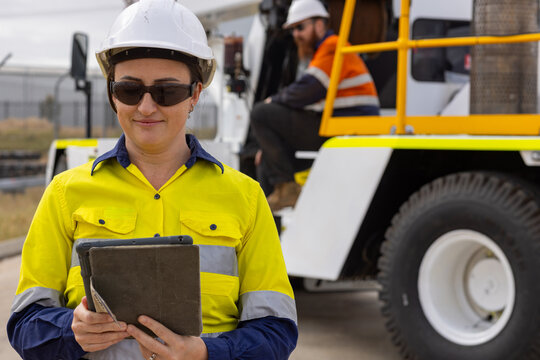 adult woman in reflective clothing holding a tablet on worksite by crane