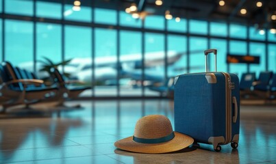 blue rolling suitcase and straw sun hat on polished airport terminal floor with empty seats and airplane outside windows, calm anticipation of travel