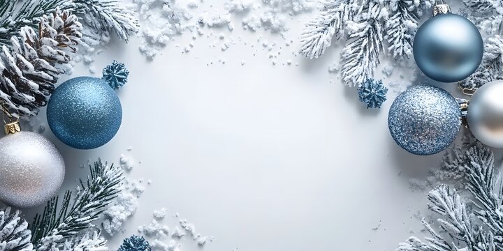 Beautiful silver and blue holiday decorations on snowy background. Generative AI.