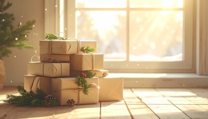 Christmas background with dark, moody and festive Christmas season elements. Elegant winter ornaments, pine cones, and snowflakes, creating a magical holiday atmosphere. Gifts and pine needles.