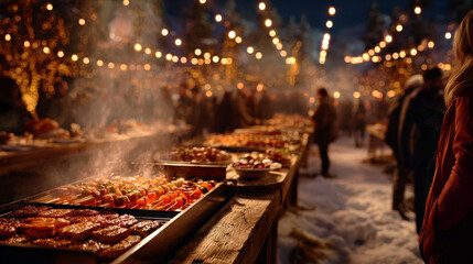 Large winter holiday cookout with grilled meats and vegetables on snowy night with festive lighting