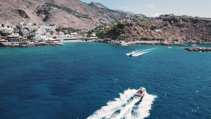 Boats racing towards the Greek Port of Sfakia. Aerial view. Travelling in a boat concept. Beautiful sea and coastline of Greece. High quality 4k footage