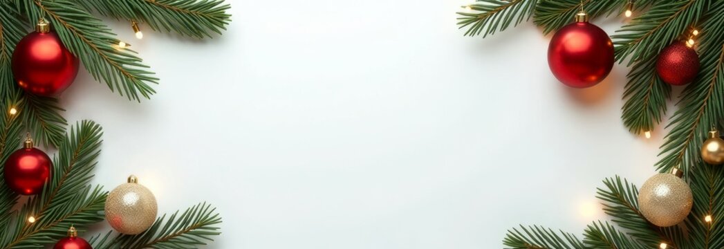 festive Christmas-themed border frame composed of pine branches with gold red baubles, Christmas lights on white background. seasonal promotions, e-commerce, flyer, header, email newsletter concept.
