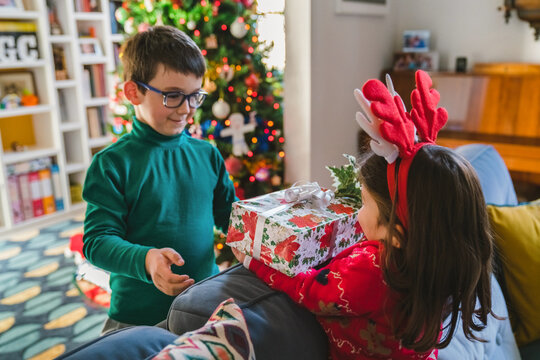 Brother with Christmas Gift for Little Sister