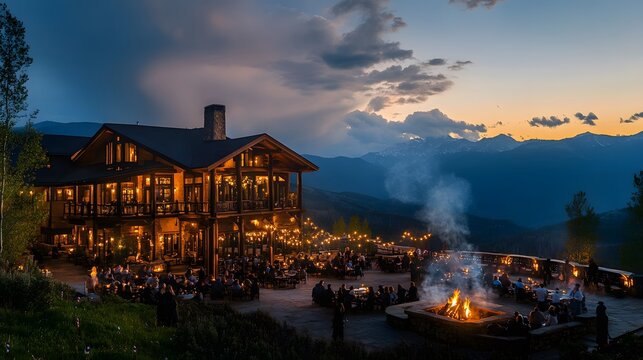 A sweeping panorama of a luxury mountain lodge decorated with holiday lights, with smoke curling from chimneys and guests gathered around outdoor firepits.