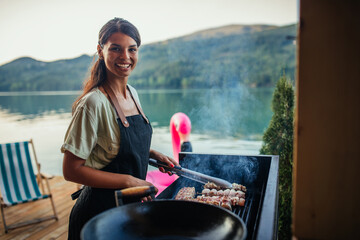 Father preparing hamburger on a grill outdoors close to a lake