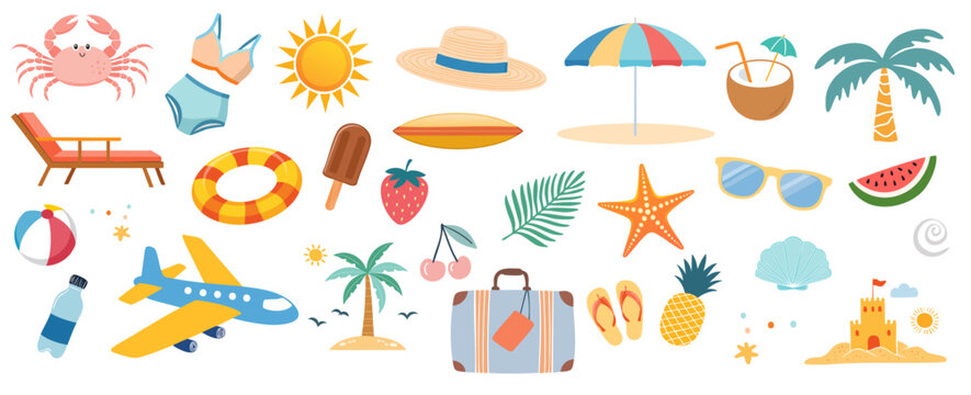 Vector summer set, cute summer holiday beach elements, summer vacation elements collection