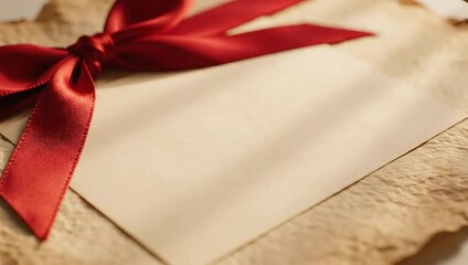 Blank paper with red ribbon on a rustic background, perfect for messages or invitations.